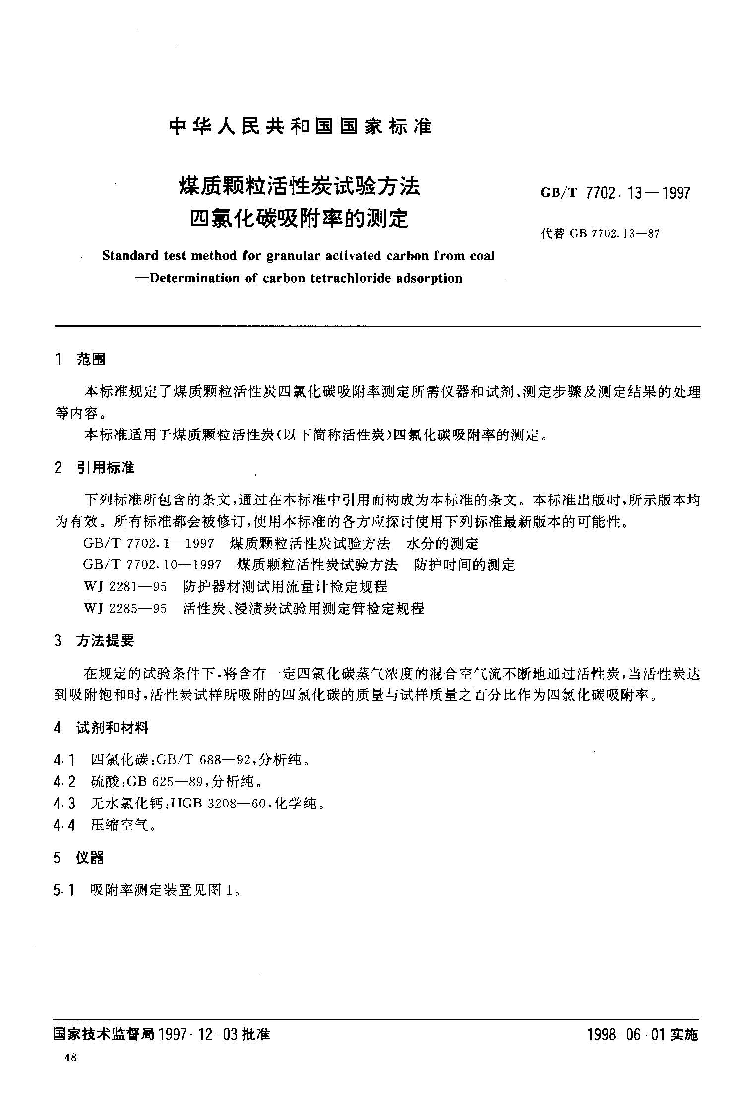 【GBT 7702.13-1997 煤質(zhì)顆粒活性炭試驗(yàn)方法 四氯化碳吸附率的測(cè)定】